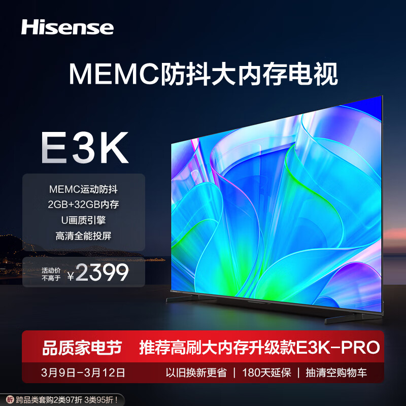 海信电视65E3K 65英寸 MEMC防抖 2GB+32GB U画质引擎 4K高清智慧屏 客厅家用液晶平板电视机 以旧换新价格:2189.00元!