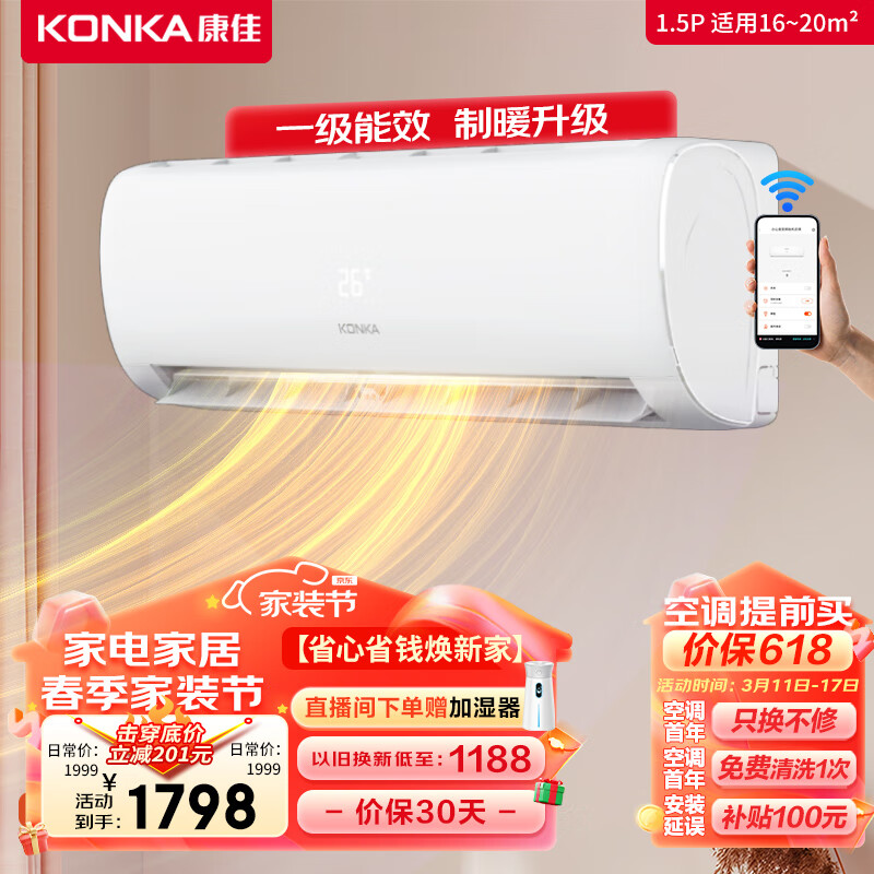 康佳(KONKA)1.5匹 新一级能效 快速冷暖 精准控温 变频空调挂机 KFR-35GW/T1 以旧换新 京东小家智能生态价格:1798.00元!