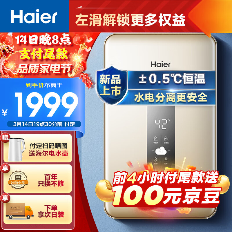 海尔(Haier)电热水器 即热式 高颜值 即开即热一键AI 节能/生活双模式 防电墙 DSH-85AD1价格:1999.00元!
