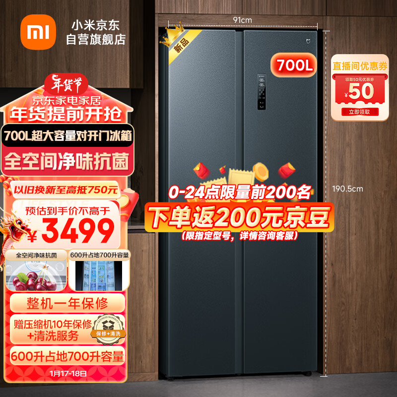 米家小米700L双开门大容量家用冰箱对开门风冷无霜一级能效【双变频净味除菌】以旧换新BCD-700WMSA价格:3699.00元!