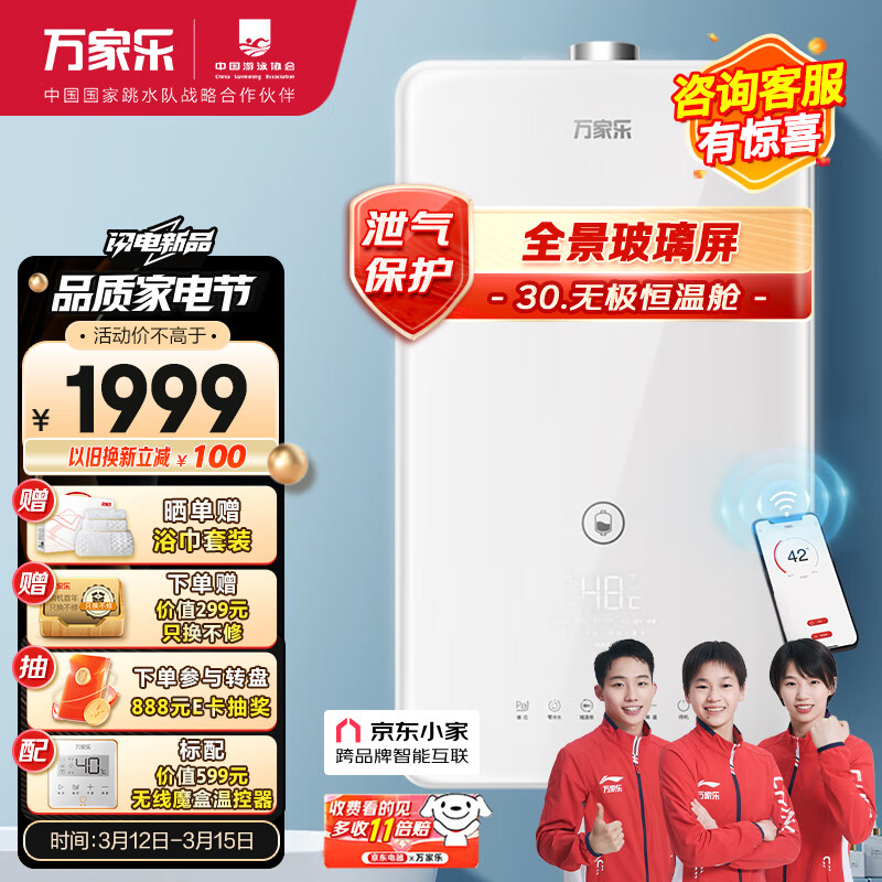 万家乐 16升防冻燃气热水器天然气无级恒温舱增压零冷水CO甲烷双安防京东小家智能三重净浴JSQ30-16RL5价格:1999.00元!