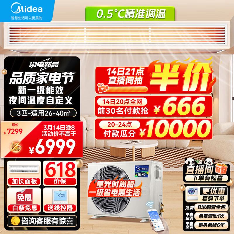 美的(Midea)中央空调风管机一拖一3匹第三代一级能效嵌入式隐形嵌系列星光时尚版KFR-72T2W/BDN1-XG(1)Ⅲ价格:7299.00元!