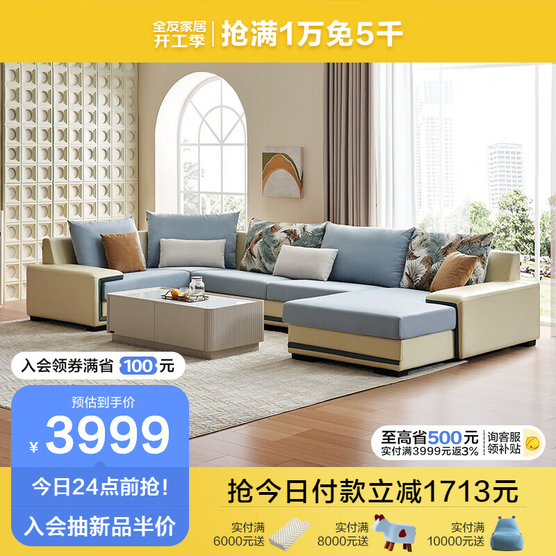 全友家居 家用布艺沙发现代简约大户型贵妃沙发家具客厅实木架102085价格:5712.86元!