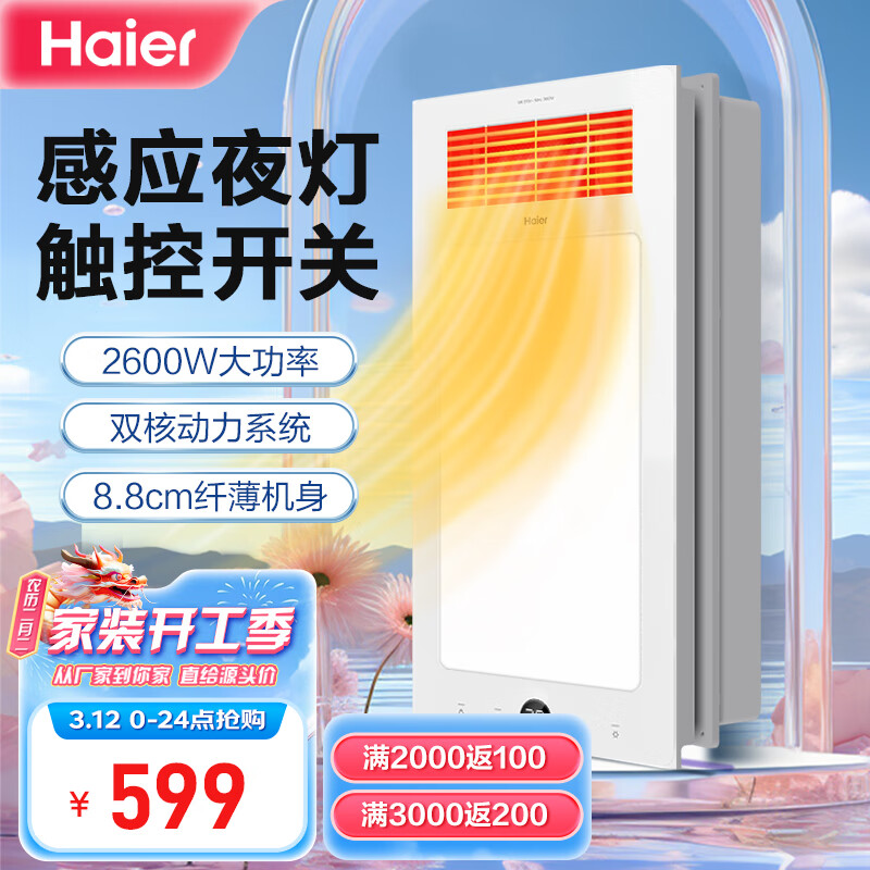 海尔风暖浴霸2600W大功率双电机触控开关感应夜灯浴室暖风机吊顶M6X价格:599.00元!