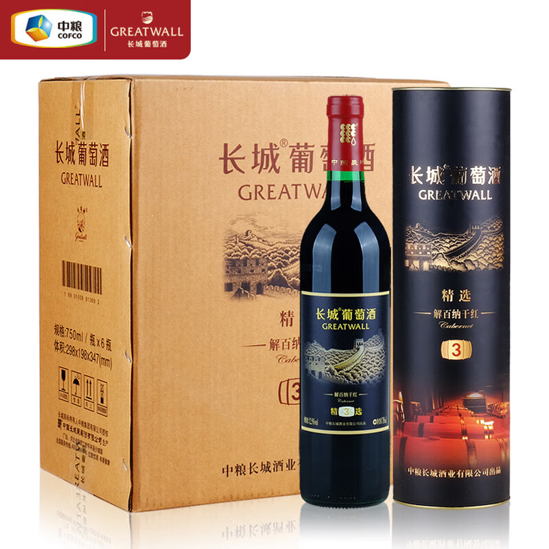 长城(GreatWall)精选3彩标解百纳筒装干红葡萄酒 国货红酒整箱六盒装750mL*6瓶价格:285.00元!