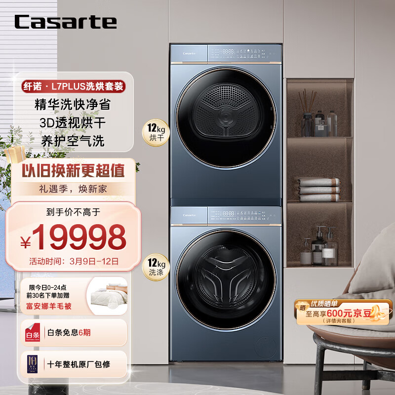 卡萨帝(Casarte)纤诺L7洗烘套装 精华洗滚筒全自动+双擎热泵烘干机 呼吸窗 3D透视烘干CGY 12FL7EU1+C1 DN12L7ELU1价格:19998.00元!