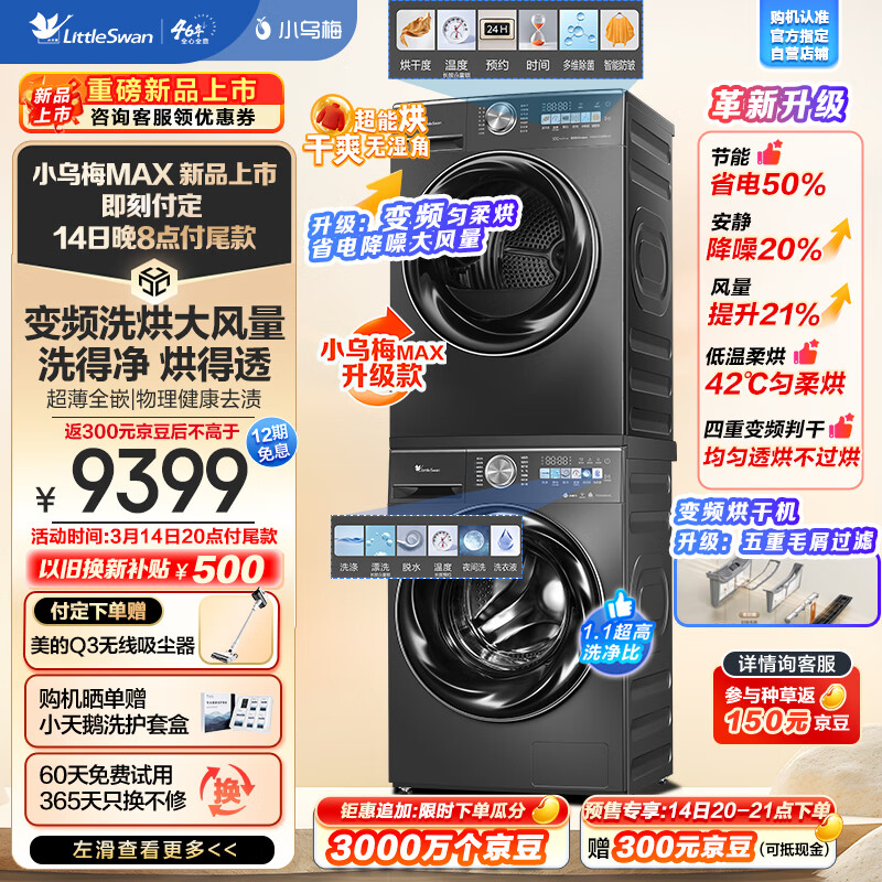 小天鹅(LittleSwan)洗烘套装10KG滚筒洗衣机全自动+变频热泵烘干机 超薄全嵌【小乌梅MAX套装】TG100RVIC+83MAX价格:9698.00元!