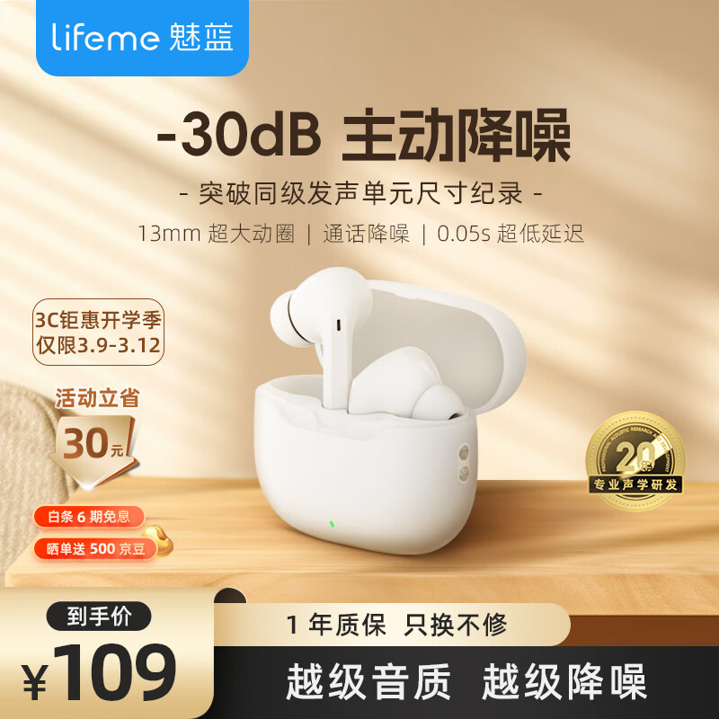 魅蓝魅族lifeme Blus L 真无线蓝牙耳机 ANC主动降噪入耳式耳机 通话降噪 蓝牙5.3 适用苹果/华为手机价格:139.00元!