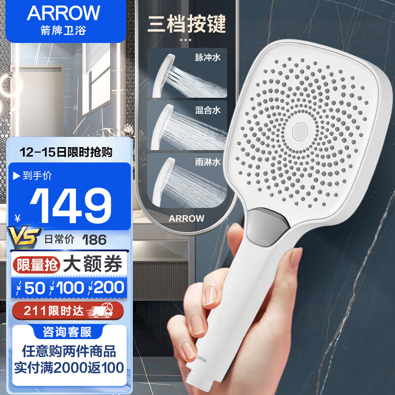 箭牌箭牌(ARROW) 手持花洒增压淋浴手持单花洒莲蓬按键切换花洒 【新款哑白】增压三档手持价格:186.25元!
