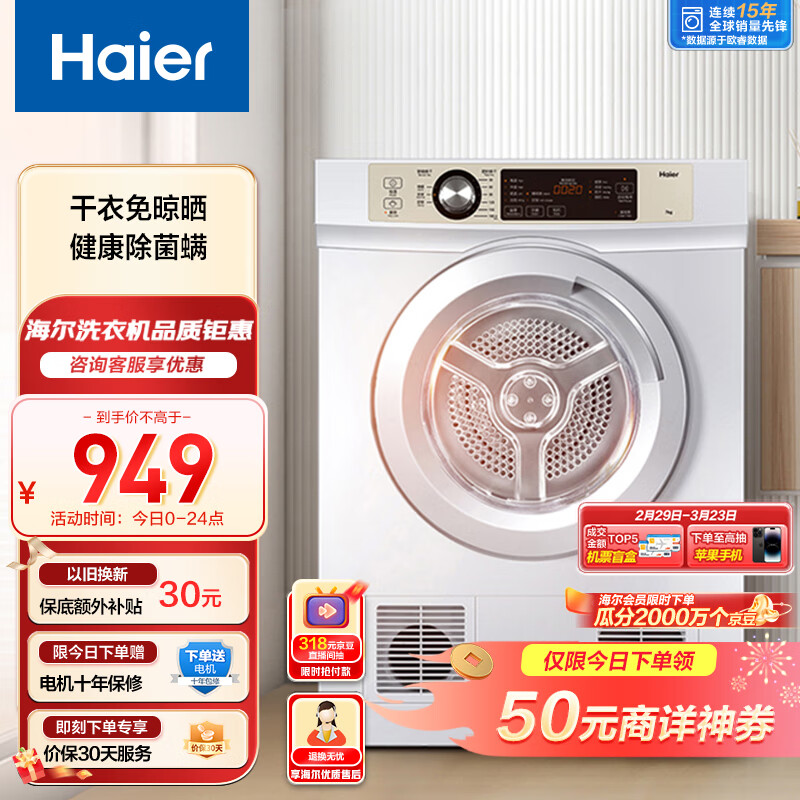 海尔(Haier)烘干机家用 7公斤直排小型干衣机 除菌除螨除潮 速烘节能 衣干即停 防皱 EGDZE7F 以旧换新价格:999.00元!