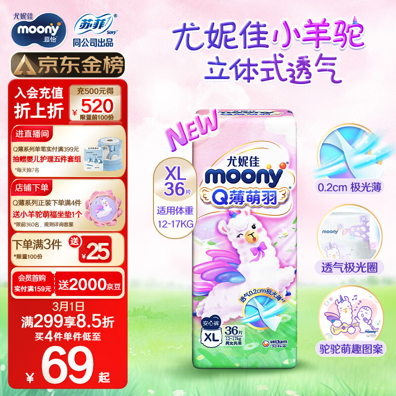 MOONY 尤妮佳Q薄萌羽小羊驼拉拉裤XL36片(12-17kg) 柔软透气轻芯超薄价格:93.30元!
