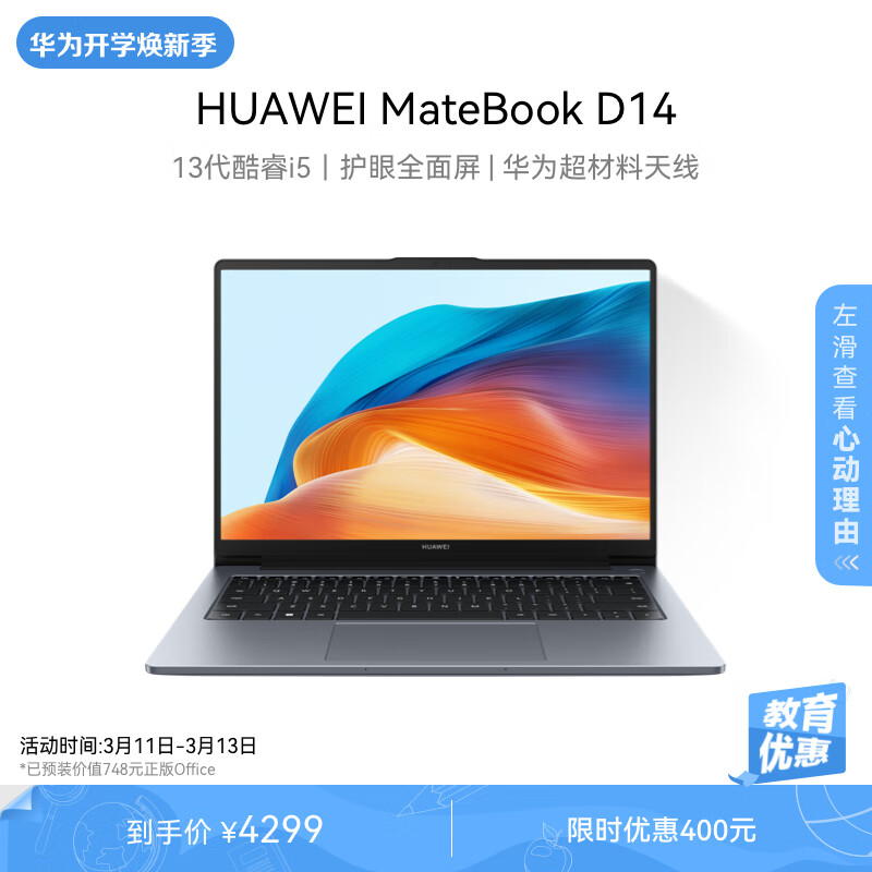 华为MateBook D 14 2023笔记本电脑 13代酷睿/14英寸护眼屏/轻薄办公本/超级终端 i5 16G 512G 深空灰价格:4299.00元!