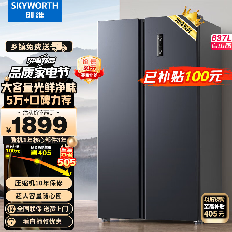 创维(SKYWORTH)光鲜637升双变频一级能效风冷无霜超薄嵌入大容量对开双开门电冰箱家用BCD-637WKPSN价格:1899.00元!