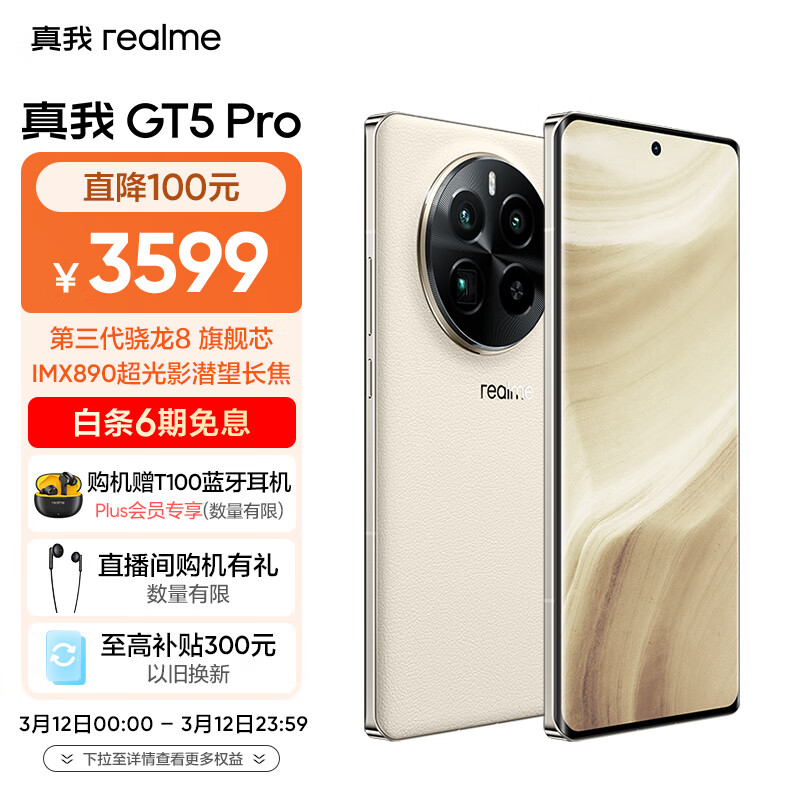 realme真我GT5 Pro第三代骁龙8旗舰芯 IMX890潜望长焦 4500nit无双屏 5G游戏AI手机 16GB+256GB皓月价格:3599.00元!