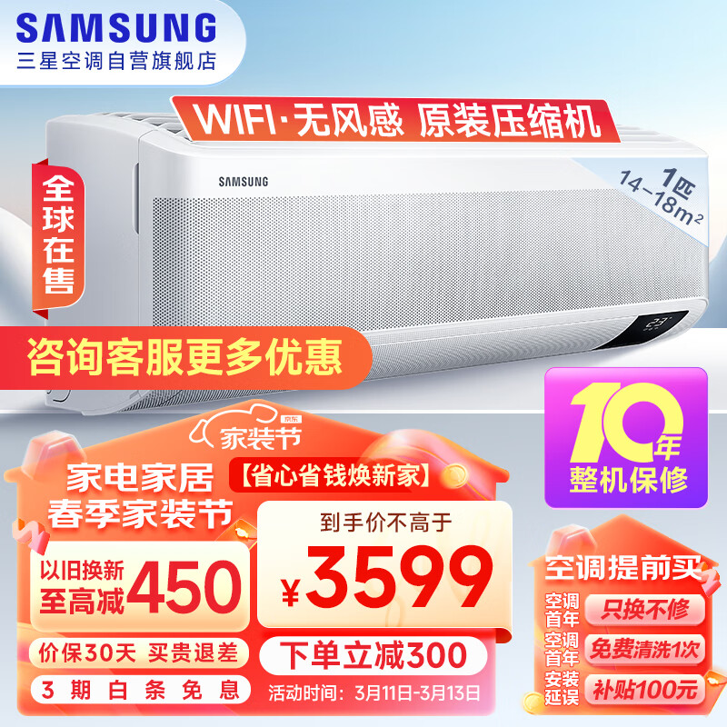 三星(SAMSUNG)14-18㎡适用新三级能效1匹 全直流变频智能WIFI无风感挂机 壁挂冷暖空调 以旧换新AR09TSFAAWKNSC价格:3899.00元!