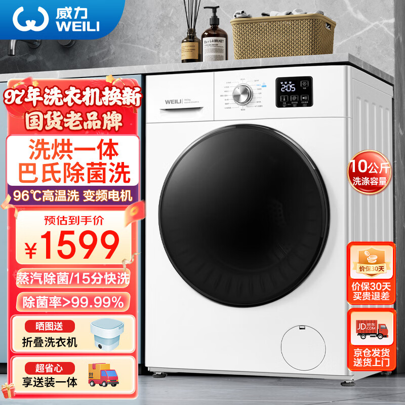 威力(WEILI)滚筒洗衣机全自动 10KG洗烘一体 超薄变频一级 巴氏除菌洗 高温筒自洁 以旧换新 XQG100-1016DPHX价格:1599.00元!