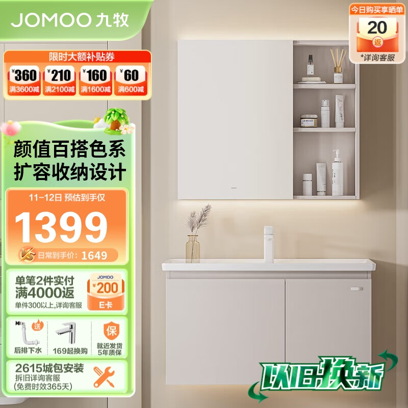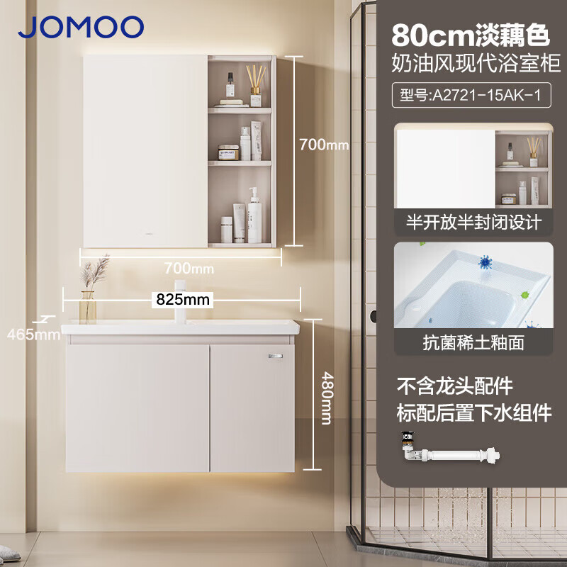 九牧(JOMOO)浴室柜 陶瓷一体盆抗菌悬挂洗脸盆柜组合淡藕色80cm A2721-15AK-1价格:1649.00元!