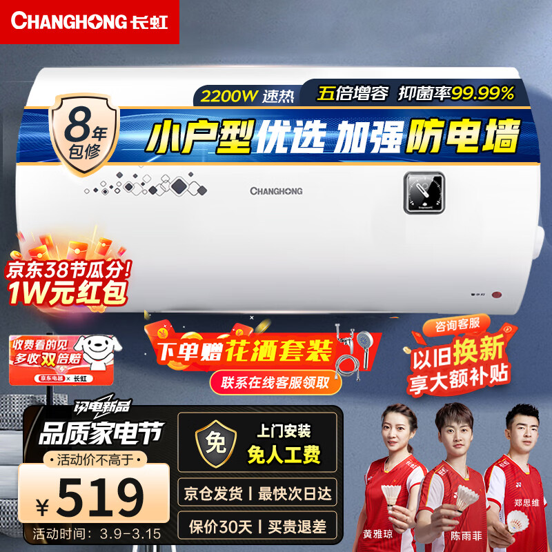长虹(CHANGHONG)60升储水式电热水器家用五倍增容2.2KW速热大功率节能保温抗腐耐用双重防漏电简易操作Y60J01价格:518.90元!