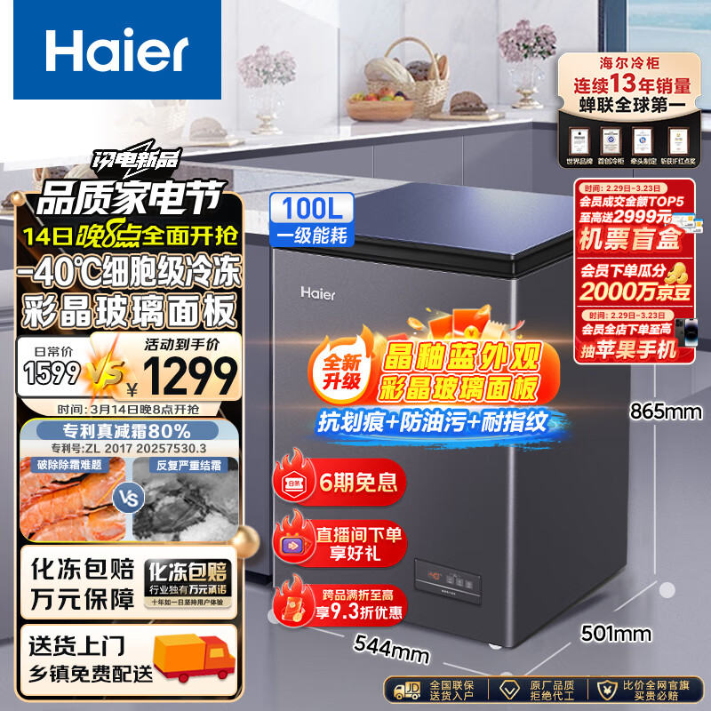 海尔(Haier)100升-40℃彩晶低霜小冰柜家用商用 冷藏柜冷冻柜冰柜小型小冰箱小型冷柜BC/BD-100GHEPGD以旧换新价格:1399.00元!