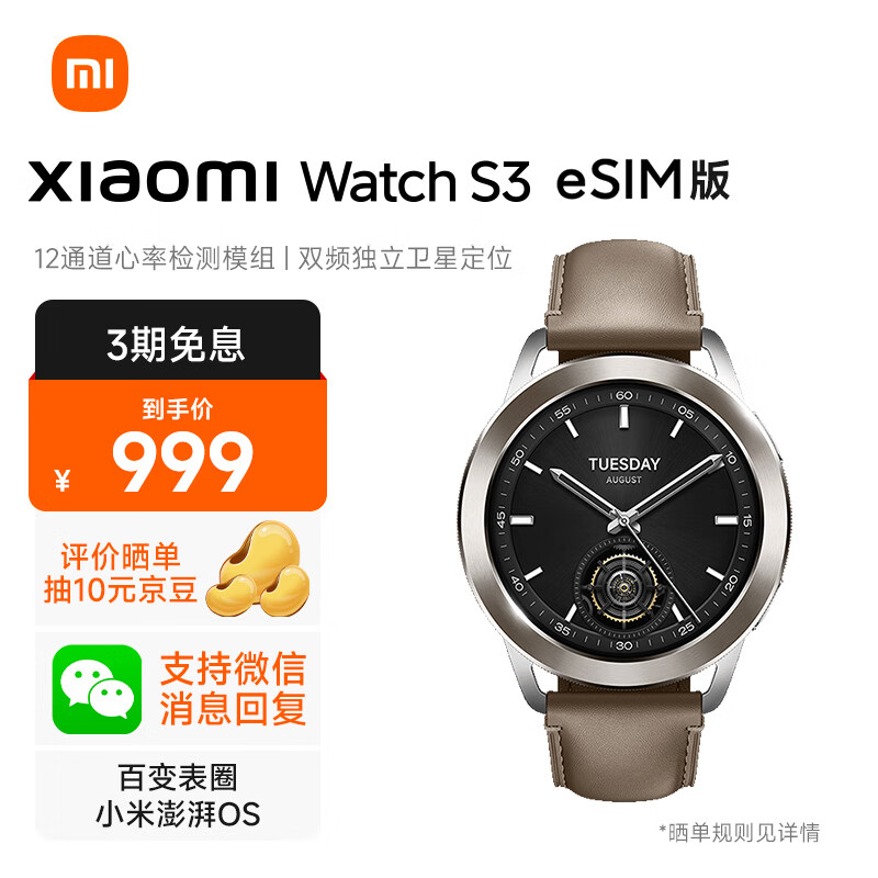 小米(MI)Xiaomi Watch S3 eSIM版 47mm 全天血氧监测 小米智能手表 运动手表 棕色真皮表带价格:999.00元!