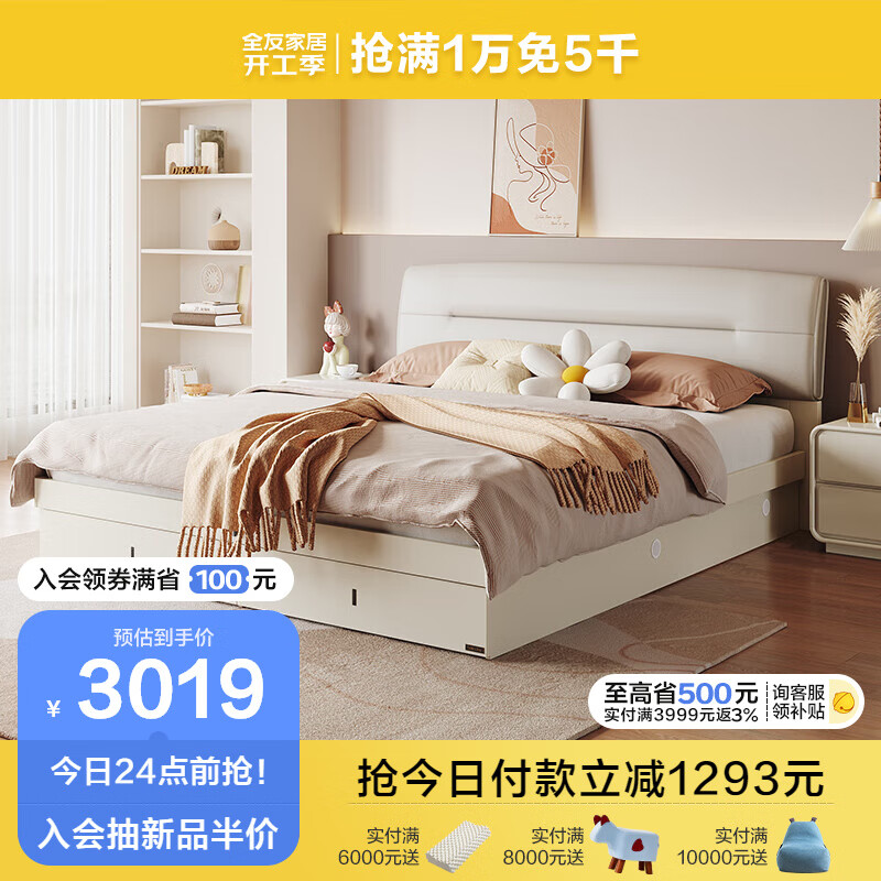 全友家居 床肤感科技布高箱储物床双人床1.5x2米卧室软靠大床DG10001价格:4312.86元!