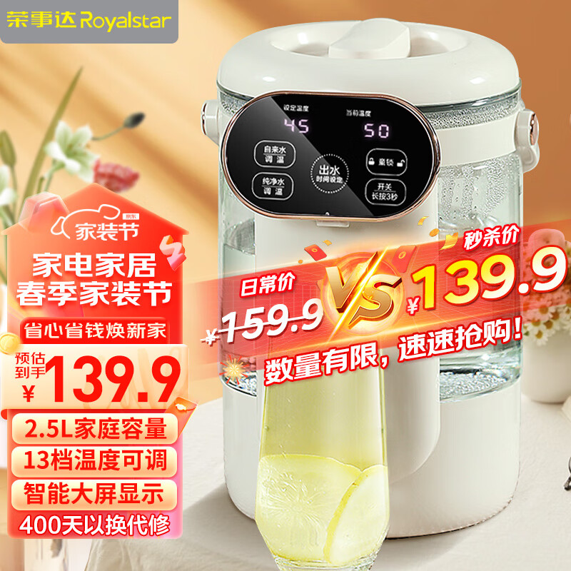 荣事达电热水瓶即热水壶恒温水壶电水壶开水瓶防烫除氯304不锈钢家用办公13段智能保温2.5L烧水壶RP-J25B价格:159.90元!