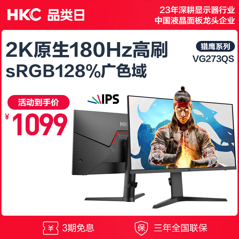 HKC 27英寸2K 180Hz FastIPS快速液晶显示屏 1ms 高清广色域旋转升降 专业电竞游戏显示器 VG273QS价格:1299.00元!
