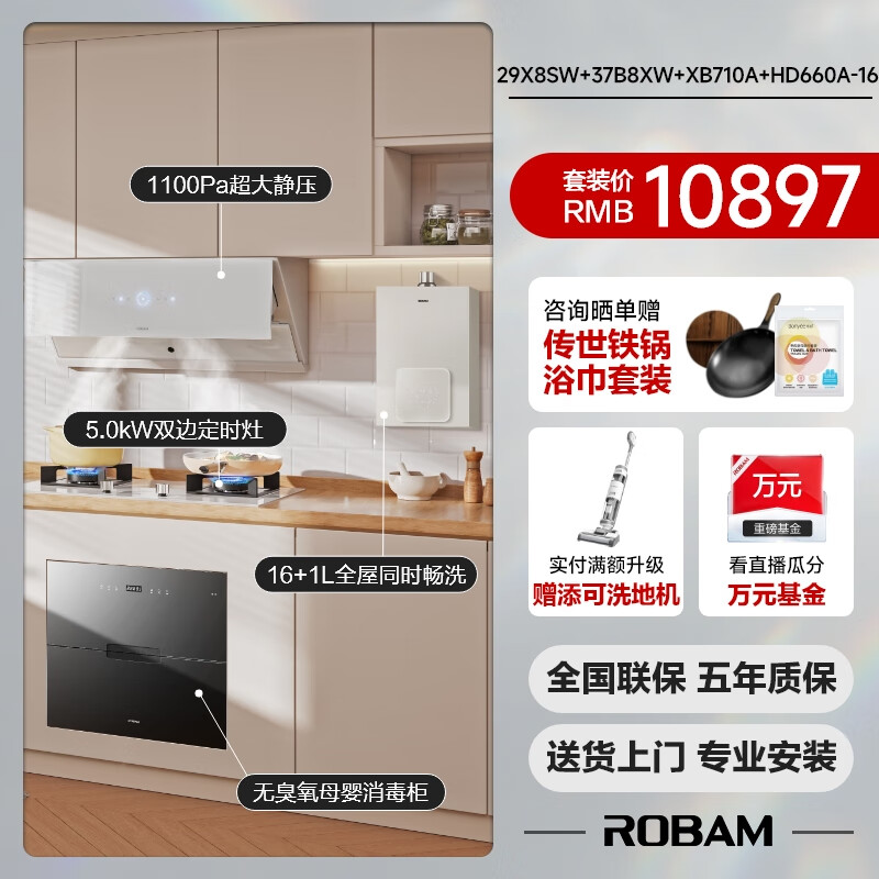 老板(Robam)厨房多件套 油烟机侧吸变频灵犀25风量烟机燃气灶具燃气热水器29X8S+37B8XWT+XB710A+HD660A-16价格:10897.00元!