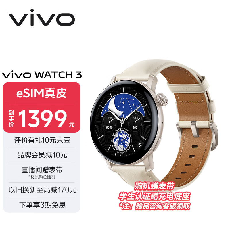 vivo WATCH 3 eSIM真皮版 皓月 AIGC智能手表表盘 血氧心率监测 自研蓝河系统 超长续航 vivowatch手表价格:1399.00元!