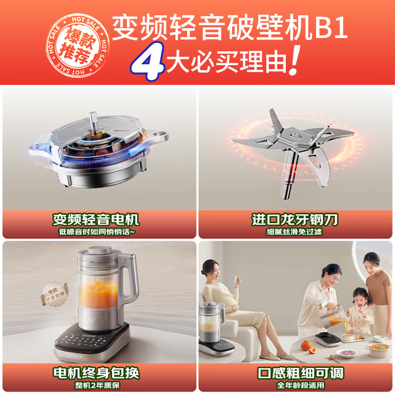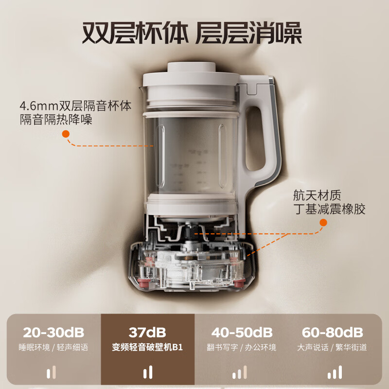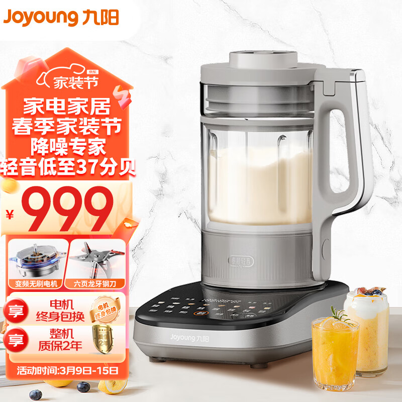 九阳(Joyoung)轻音破壁机 家用榨汁机豆浆机料理机1.75L大容量 口感可调 多重降噪 变频轻音 触控彩屏 B1价格:999.00元!