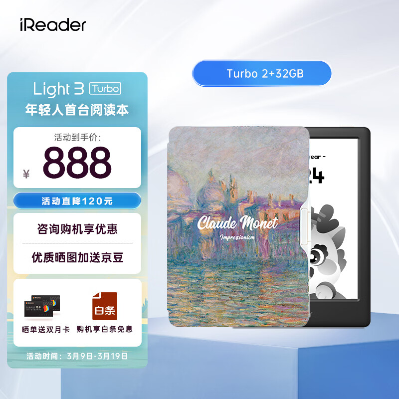 掌阅iReader Light3 Turbo智能阅读本 电子书阅读器 6英寸墨水屏电纸书 32G 沉墨 莫奈运河·翻页键套装价格:888.00元!
