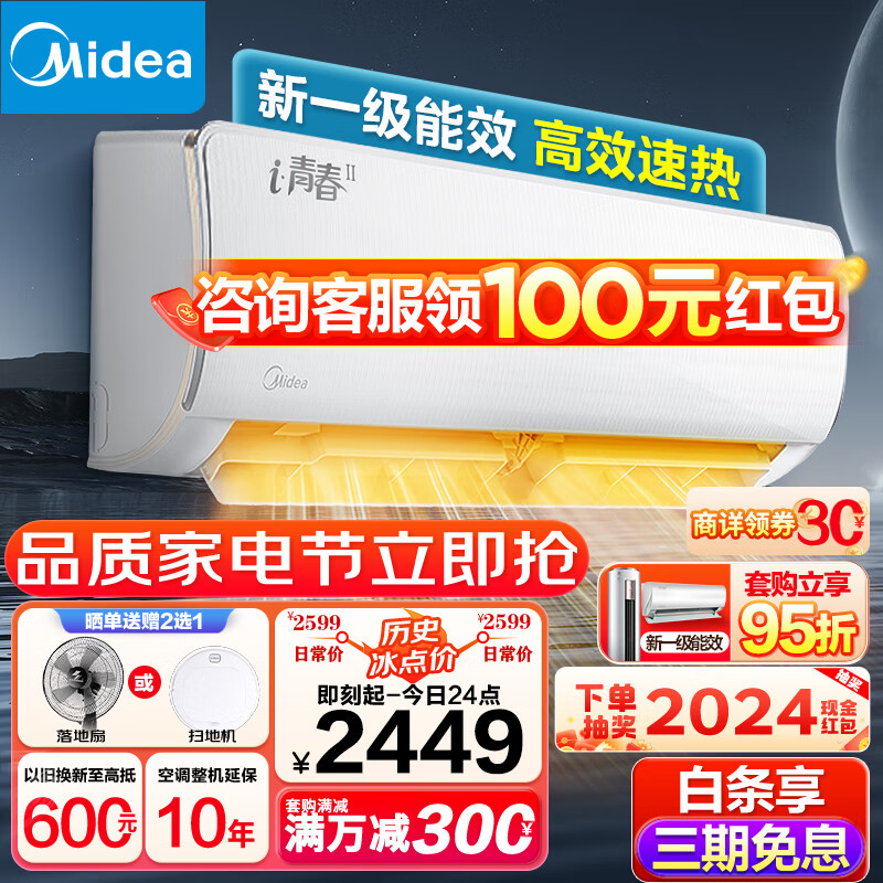 美的(Midea)i青春2 大1匹 新一级能效变频冷暖 智能家电 家用卧室壁挂式空调挂机 KFR-26GW/N8XHB1 II价格:2449.00元!