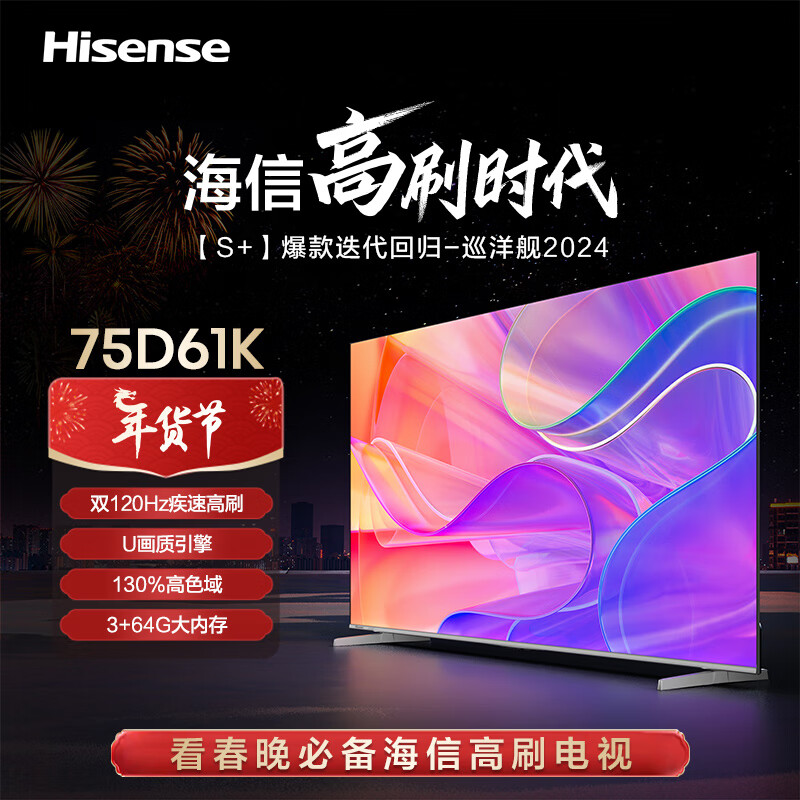 海信电视 75D61K S+ 75英寸3+64GB大内存AI智能语音 120Hz疾速刷新 130%高色域 U画质引擎价格:7999.00元!