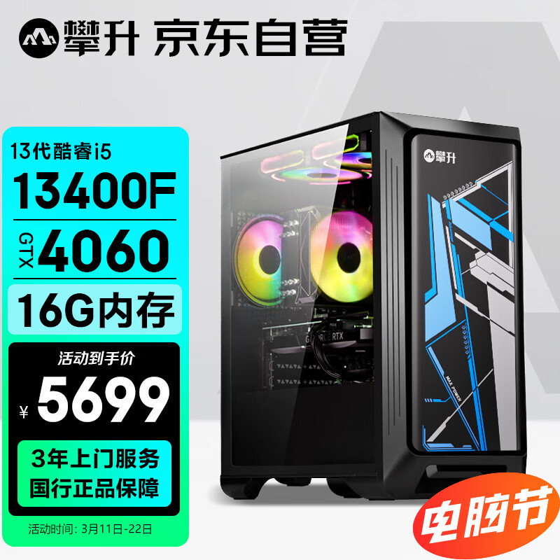攀升 战神2 酷睿i5设计师电竞游戏台式电脑主机(13代i5-13400F RTX4060 8G显卡 16G 1TB SSD WiFi)价格:5699.00元!