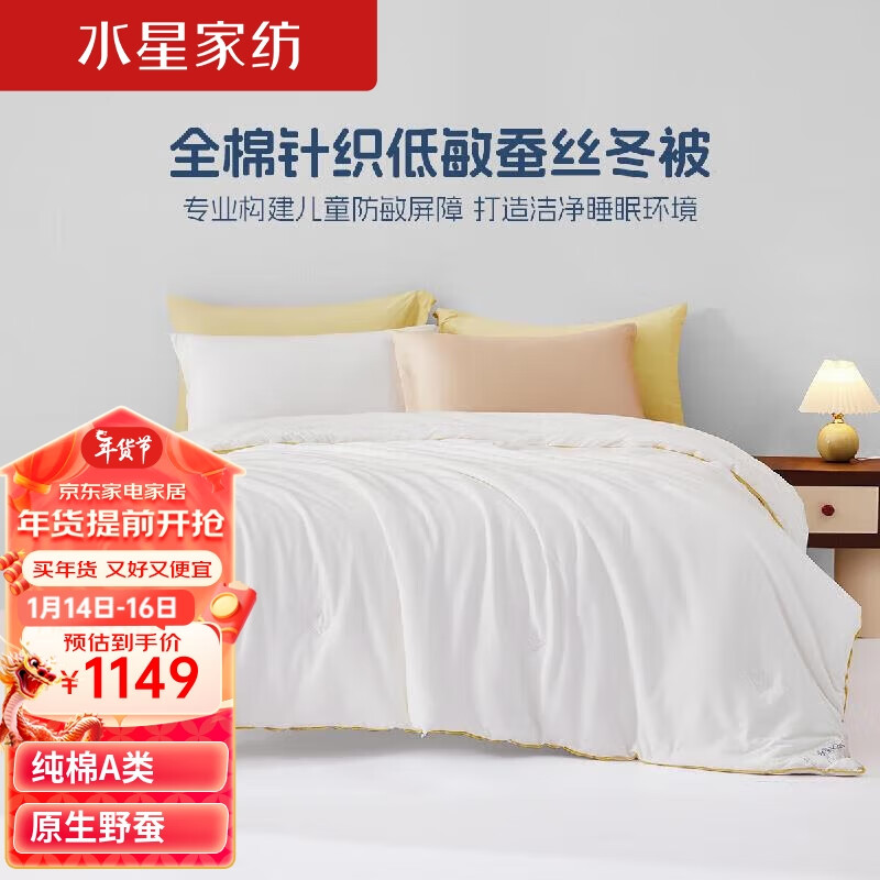 水星儿童低敏被A类纯棉100%蚕丝秋冬双人厚被子 约7.9斤220*240cm白价格:2049.00元!