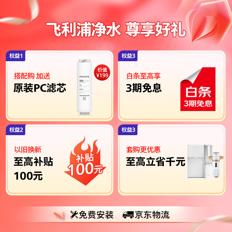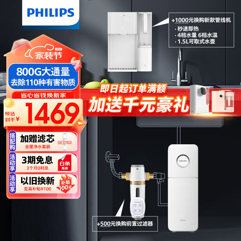 飞利浦(PHILIPS)净水器家用净水机引擎800G 5年长效RO反渗透直饮机 2.1L/min大流速800G通量净水器AUT7006/7025价格:1469.00元!