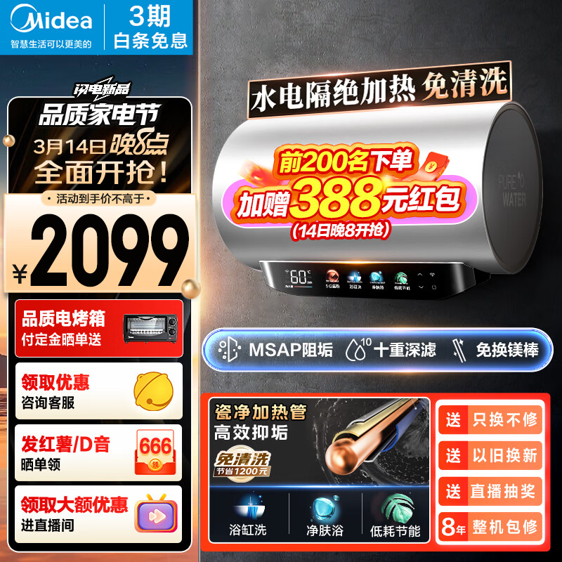 美的(Midea)水电分离60升电热水器家用 3300W变频 10重过滤净肤 瓷净舱除余氯 内胆免清洗F6033-PE9(HE)价格:2099.00元!