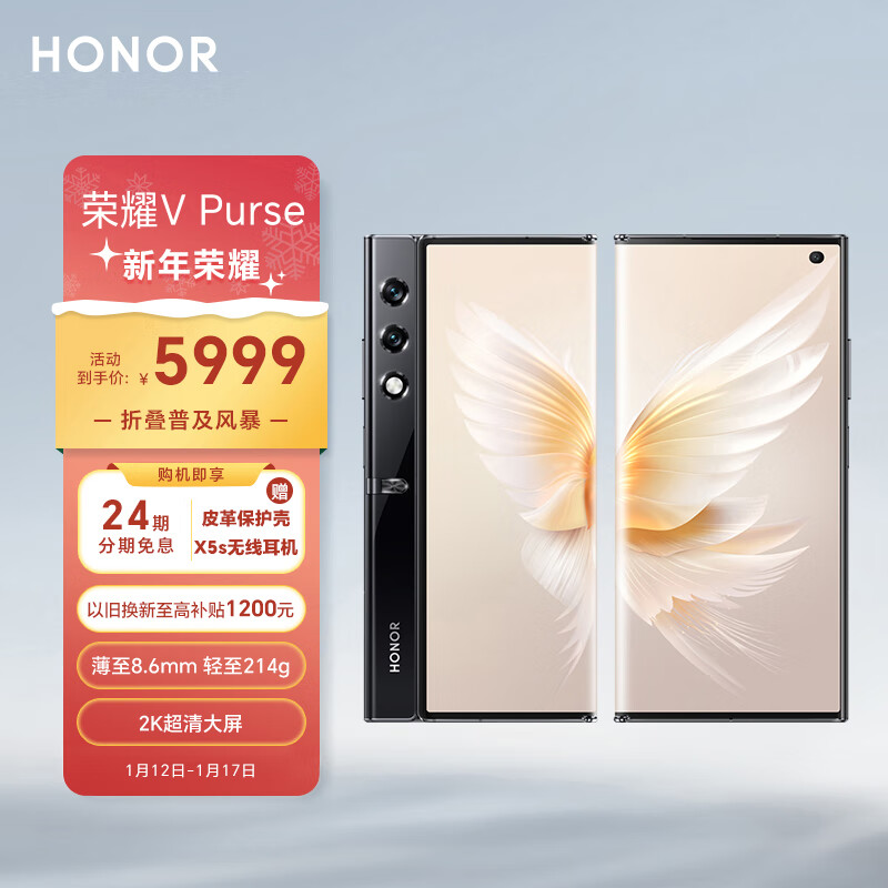 荣耀V Purse 折叠屏 8.6mm超轻薄 2K超清大屏 超自由写真相机 5G手机 16GB+256GB 雅黑色价格:5999.00元!