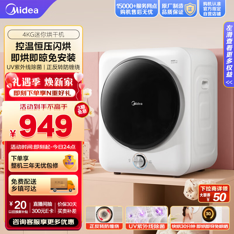 美的(Midea) 4公斤烘干机 回南天神器 滚筒式干衣机小型烘衣机 衣物即烘即穿免安装 紫外线除菌 MH40V10E价格:949.00元!