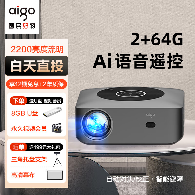 爱国者 H68投影仪家用1080P高清办公投影机家庭影院(2200亮度流明 2+64G内存 自动对焦校正 智能避障)价格:1499.00元!