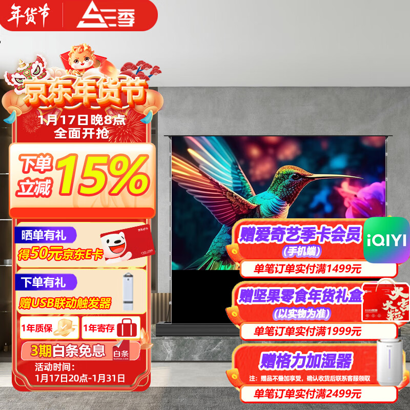 三季电动地升幕布150英寸16:9超短焦投影仪激光电视黑栅抗光拉线幕布智能语音遥控自动升降投影幕DSHK价格:16999.00元!