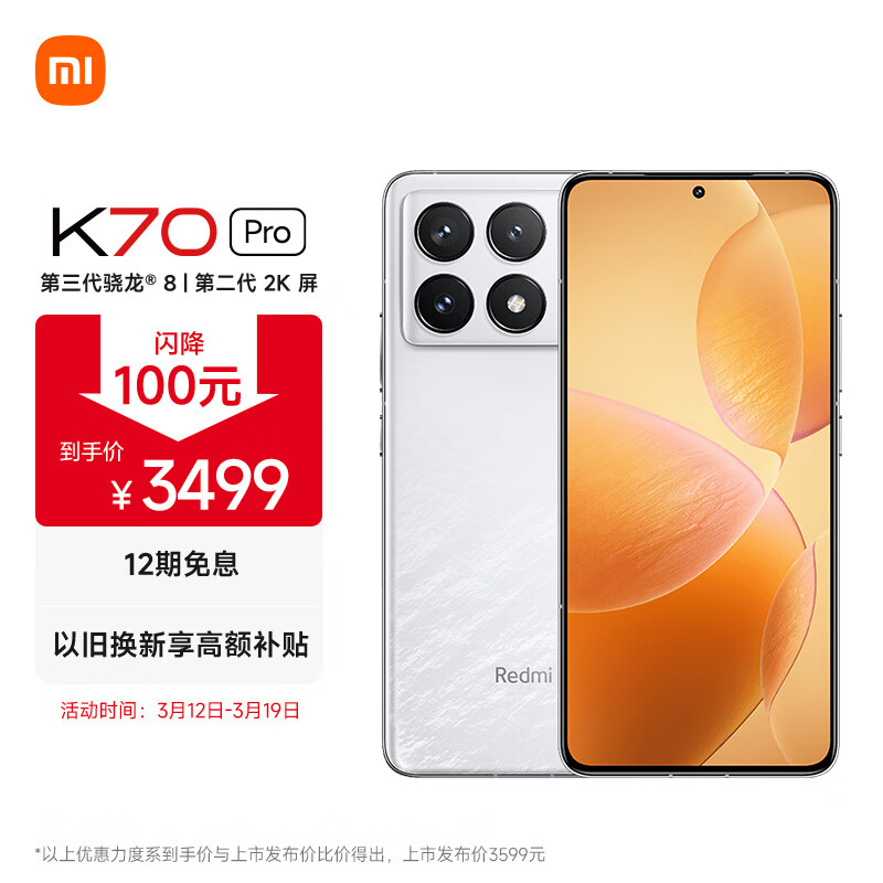 小米(MI)Redmi K70 Pro 第三代骁龙? 8 小米澎湃OS 第二代2K屏 16GB+256GB 晴雪 小米红米K70 Pro价格:3499.00元!