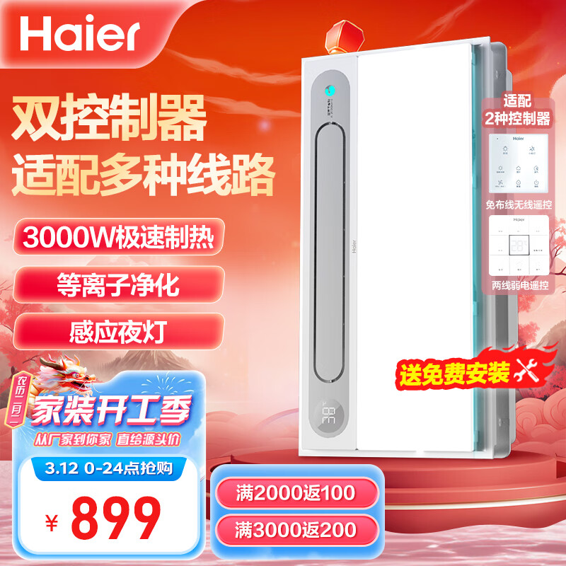 海尔(Haier)双控风暖浴霸照明排气一体集成吊顶卫生间风暖式浴霸H8价格:999.00元!