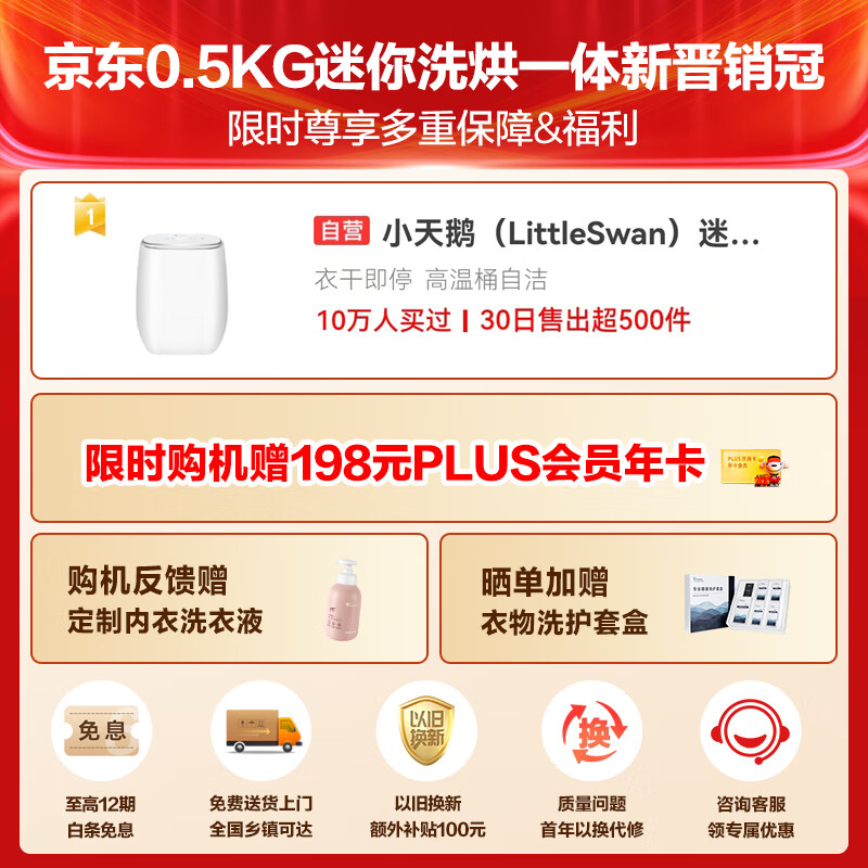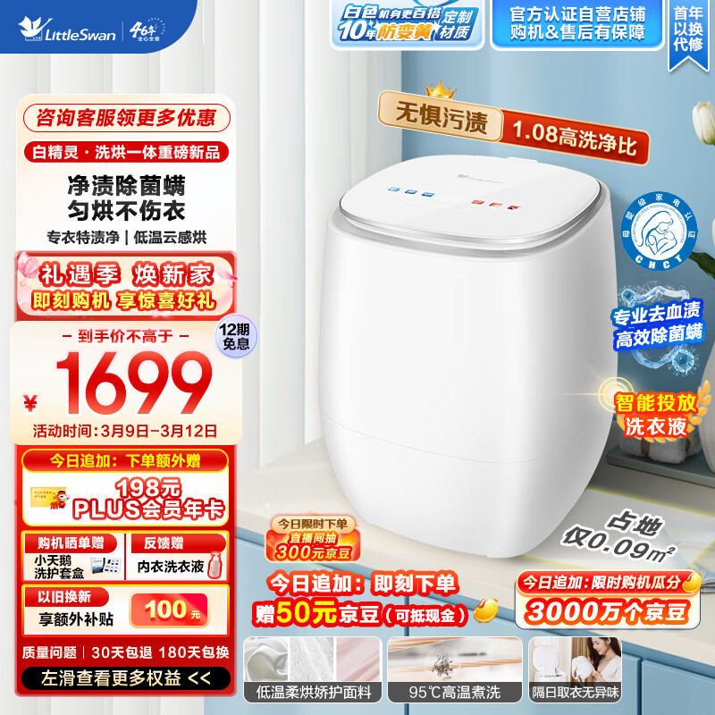 小天鹅(LittleSwan)0.5KG迷你洗衣机全自动 白精灵 去血渍洗烘一体 内衣裤洗衣机 高温煮洗除菌螨 精准智投 TND5VD0WE价格:1699.00元!