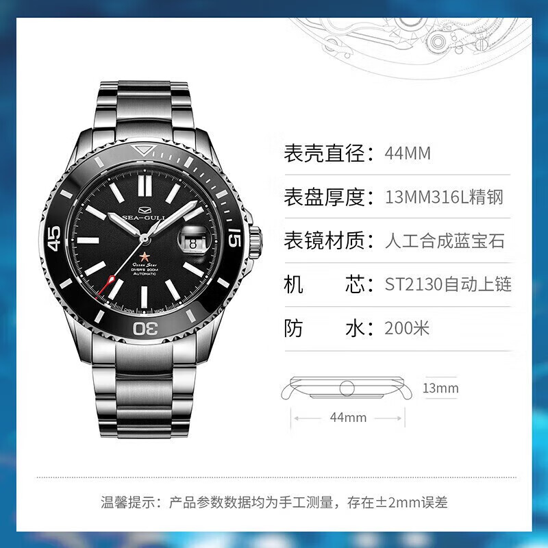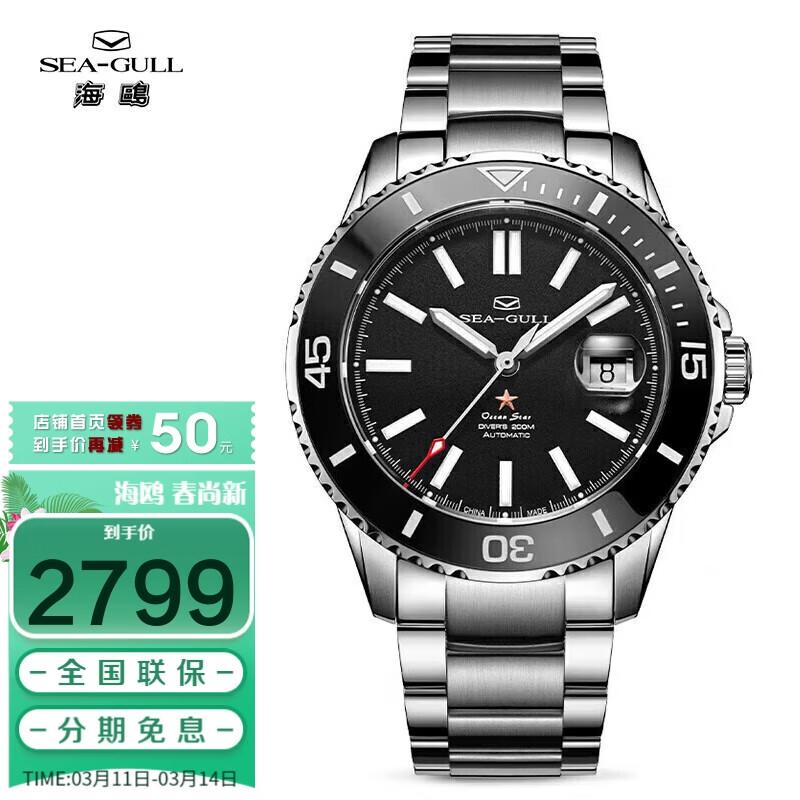 海鸥(SEAGULL)手表男士自动机械表 男表礼物 日历夜光200米防水陶瓷圈潜水腕表价格:3099.00元!