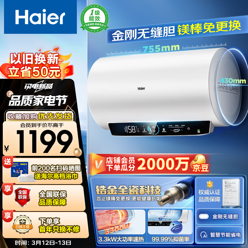 海尔(Haier)瓷净阻垢真镁棒免更换60升热水器电热水器家用3300W一级能效金刚无缝胆EC6001-PE5U1价格:1299.00元!