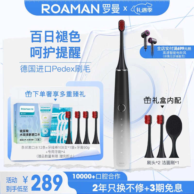 罗曼(ROAMAN)电动牙刷成人情侣套装男女智能声波电动牙刷软毛洁面 T40小心机墨雾黑 节日新年礼物价格:299.00元!
