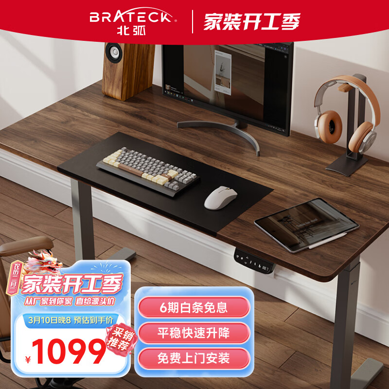 Brateck电动升降电脑桌 北弧站立办公升降电脑桌 工作升降台 K2棕1.2米价格:1299.00元!