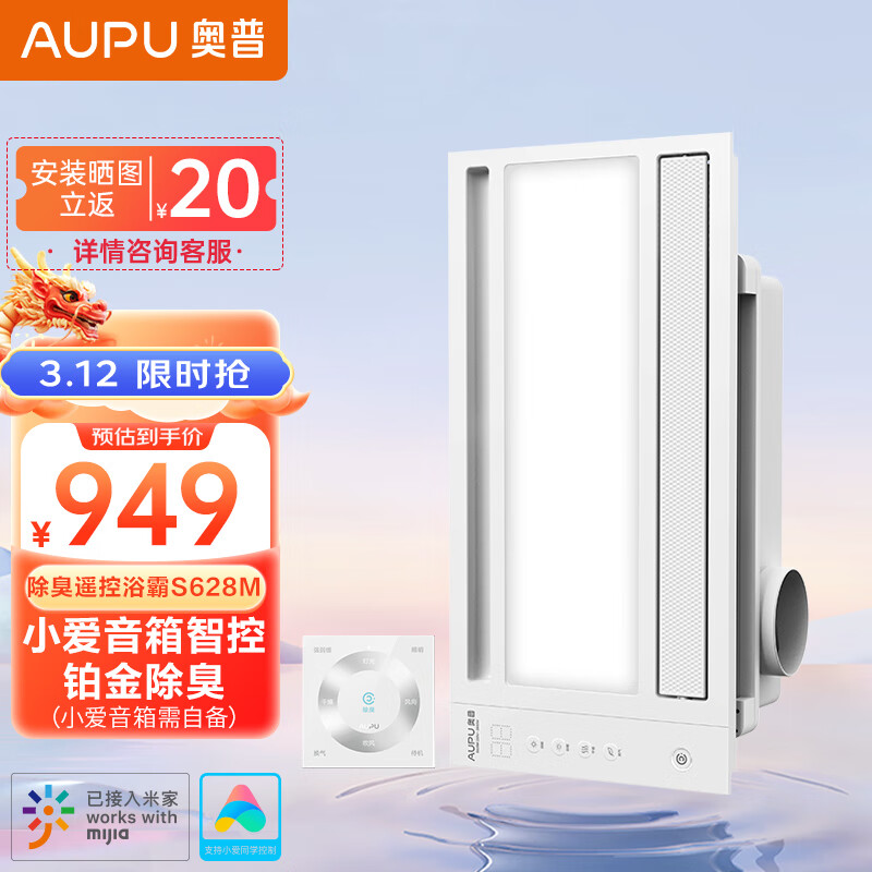 奥普(AUPU)浴霸S628M风暖浴霸 大摆页强弱风暖 铂金除臭 已接入米家无线遥控价格:1399.00元!