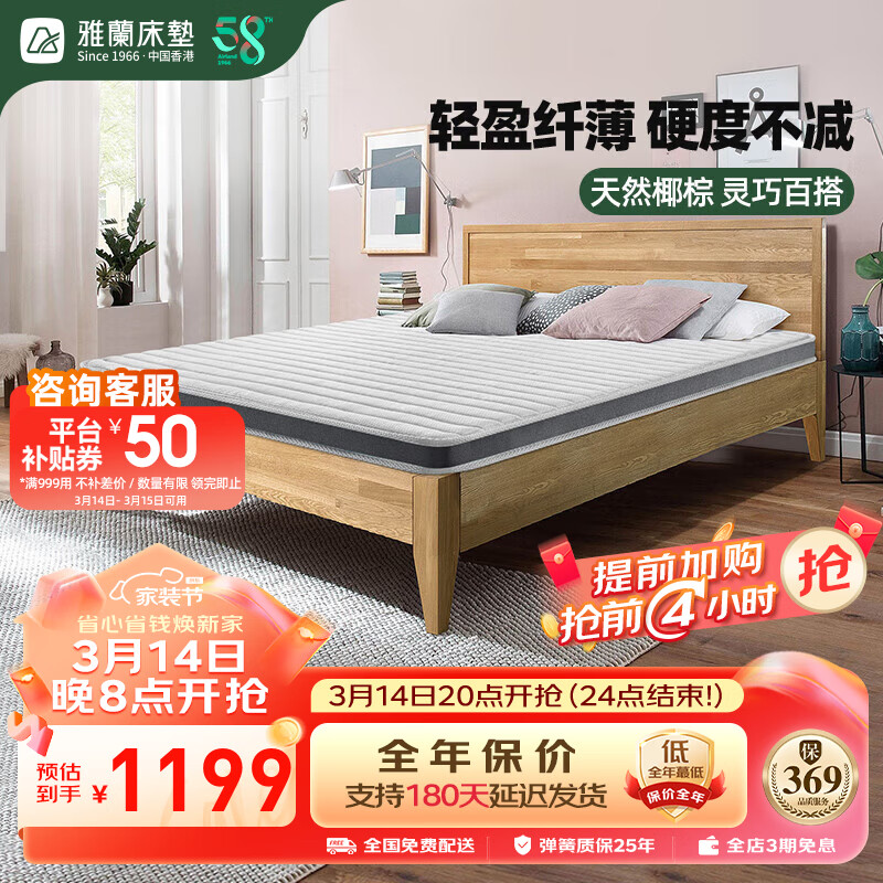 雅兰椰棕床垫偏硬舒脊学生薄床垫宿舍床垫 硬核椰棕款【5cm】1.5*2m价格:1499.00元!